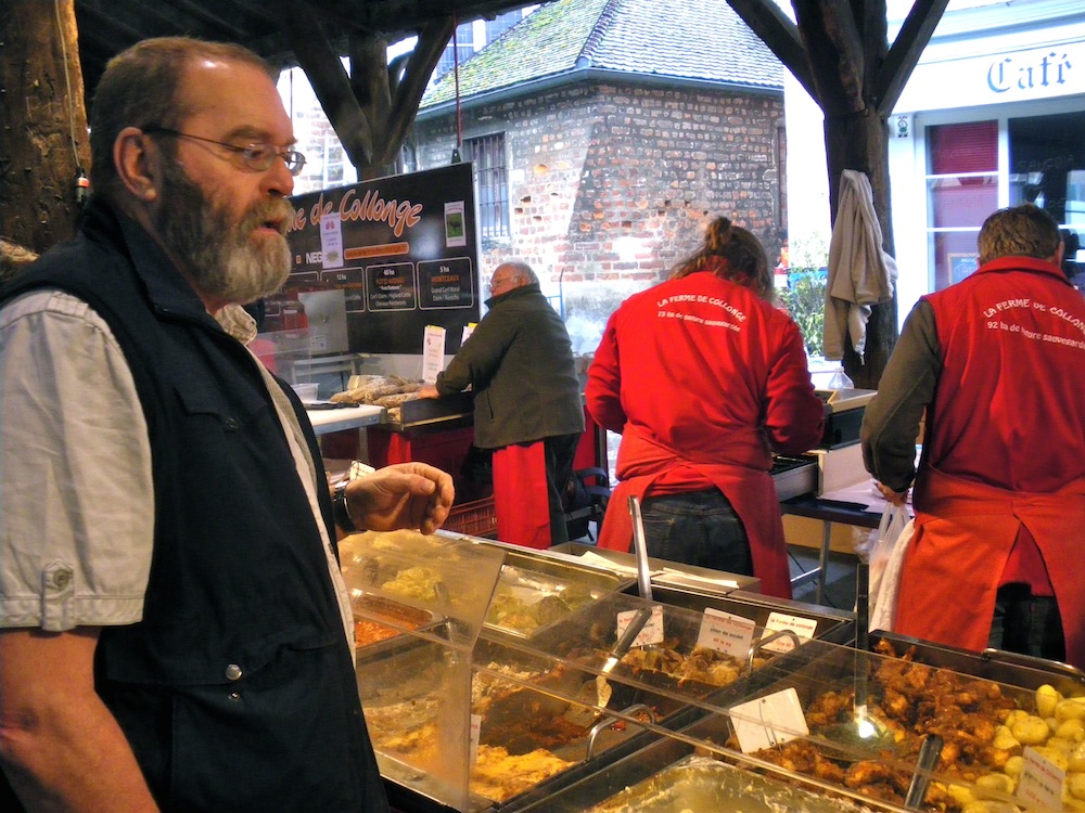 Next is our favourite stall; the farm co-operative that cooks and sells Bressane chicken - and lots more besides. There are hot ham hocks, gammon joints, sausages, offal, mountains of sauerkraut (which is enormously popular in France: they call it choucroute). Here also are potatoes in many forms - lightly boiled in their skins with parsley and butter, or (my absolute favourite) pommes dauphinoise with the creamiest, tastiest sauce imaginable.